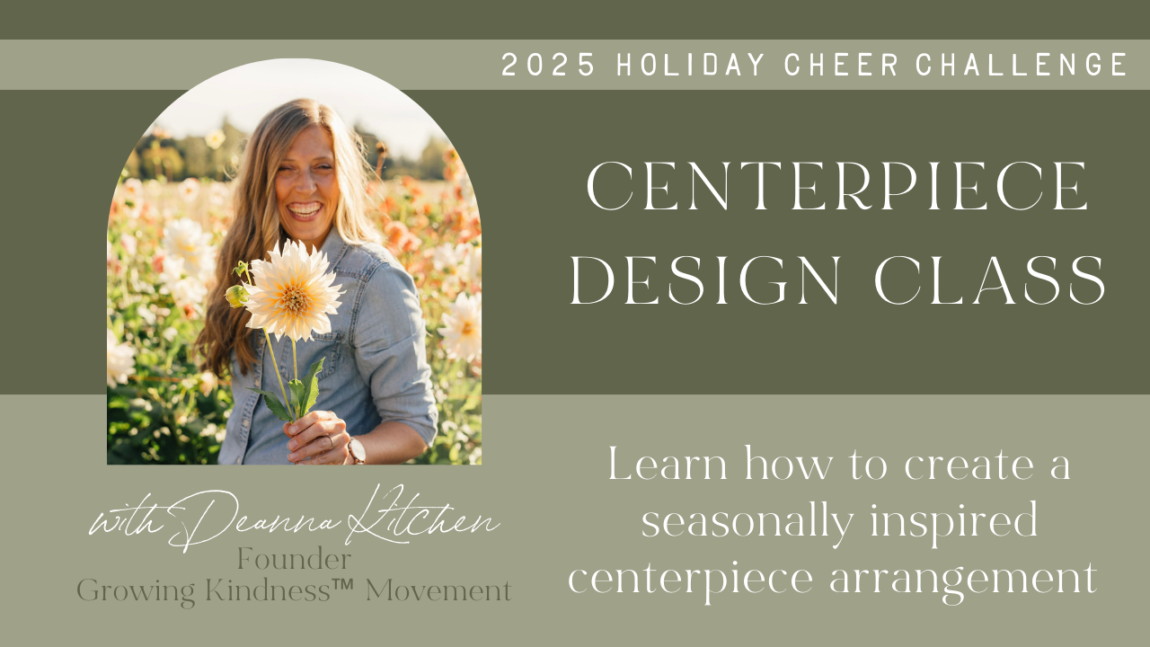 Founder of Growing Kindness, Deanna Kitchen will be teaching you how to make a beautiful, mostly foraged, holiday inspired centerpiece in this workshop recording.Â
